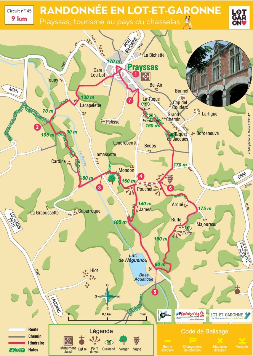 Dénivelée cumulée : 265 m; La cité médiévale de Prayssas, aux contours arrondis, fait la fête aux fruits chaque été. Cette randonnée par des chemins assez souvent ombragés avec des passages escarpés permet de rallier la base aquatique de Néguenou.