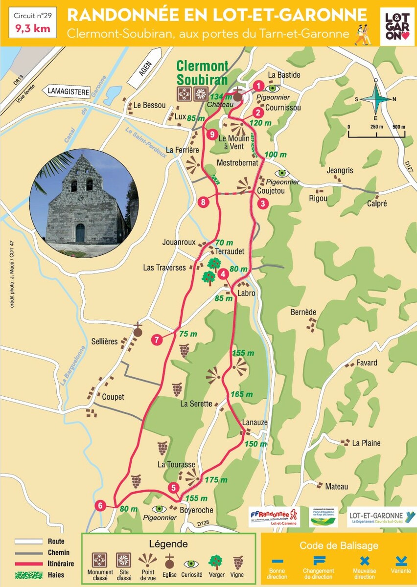 Dénivelée cumulée : 215 m. A l’aller, le circuit utilise des routes et des chemins panoramiques dominant la vallée de la Garonne. Le retour s’effectue sur l’ancienne voie romaine tracée au pied du coteau, hors d’eau des crues du fleuve.