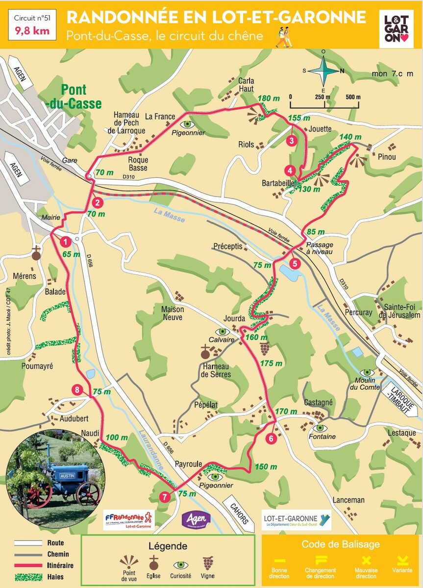 Dénivelée cumulée : 300 m. Casse qui signifie chêne ou bois de chêne en occitan a donné son nom à ce village de la périphérie agenaise. Des pentes un peu fortes rythment cette randonnée dans les premiers contreforts des coteaux du Pays de Serres