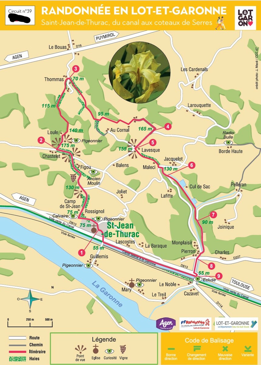 Dénivelée cumulée : 260 m. Un départ très pentu, mais la récompense est en haut, avec un vaste panorama sur la vallée de la Garonne, les coteaux de Gascogne, et plus loin encore, selon le temps, les Pyrénées. Au nord, ce sont les coteaux du Pays de Serres, de Bon-Encontre à Puymirol. Le retour est plus calme, sur la Voie Verte du Canal des 2 Mers