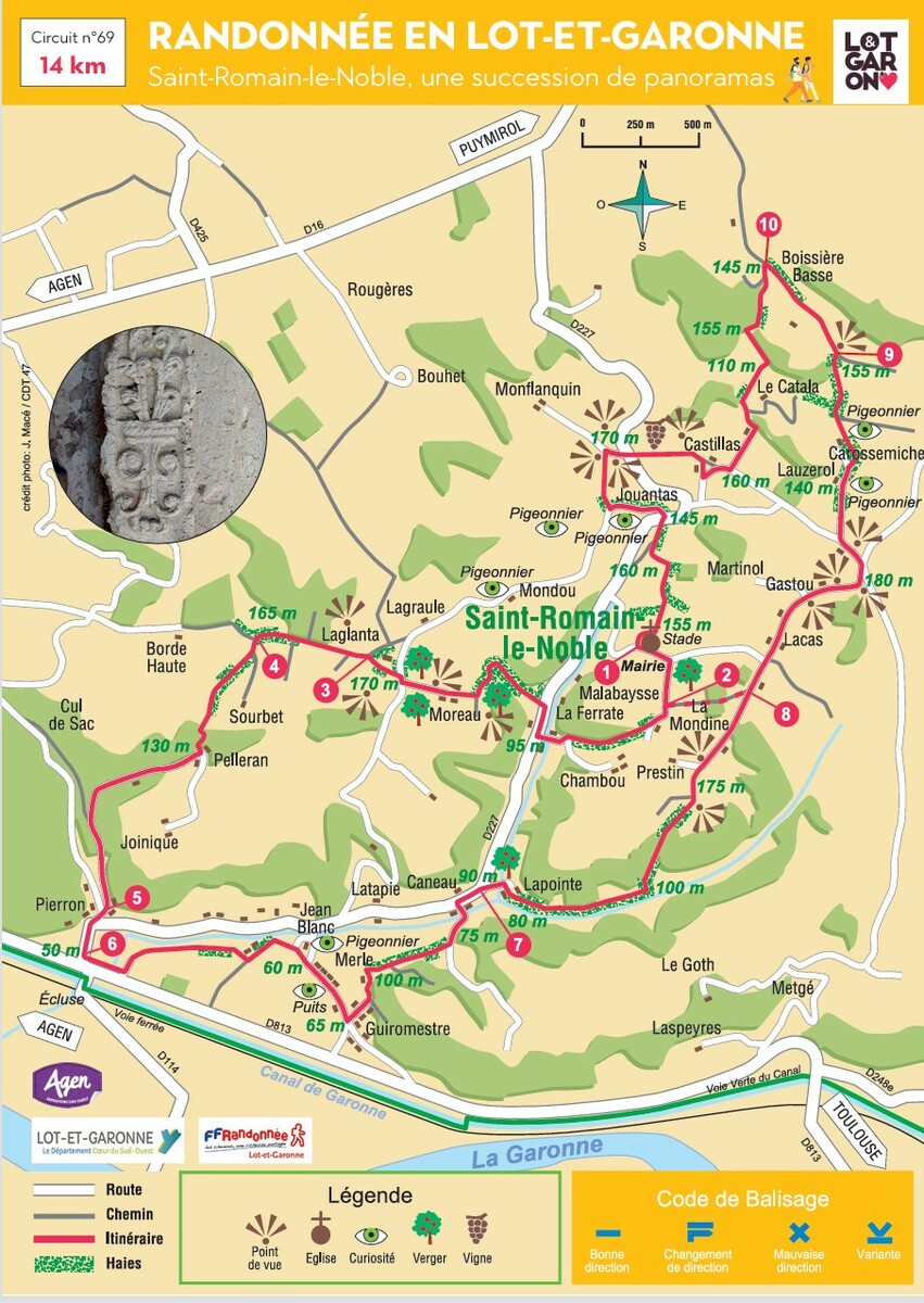 Dénivelée cumulée : 435 m. 360° de panoramas, du plus proche au plus lointain, la vallée de la Garonne, les villages alentour de Clermont-Soubiran ou de Saint-Pierre-de-Clairac, la bastide de Puymirol ou par temps clair, les crêtes des Pyrénées