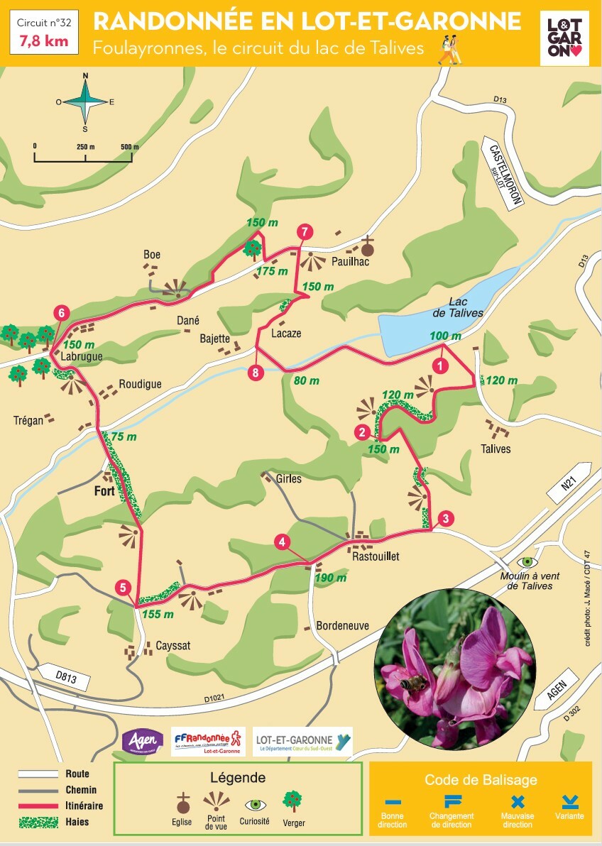Dénivelée cumulée : 275 m. Cette courte randonnée aux montées très raides est assez souvent ombragée. Elle démarre sur les berges du lac de Talives, un lieu très prisé des pêcheurs Agenais