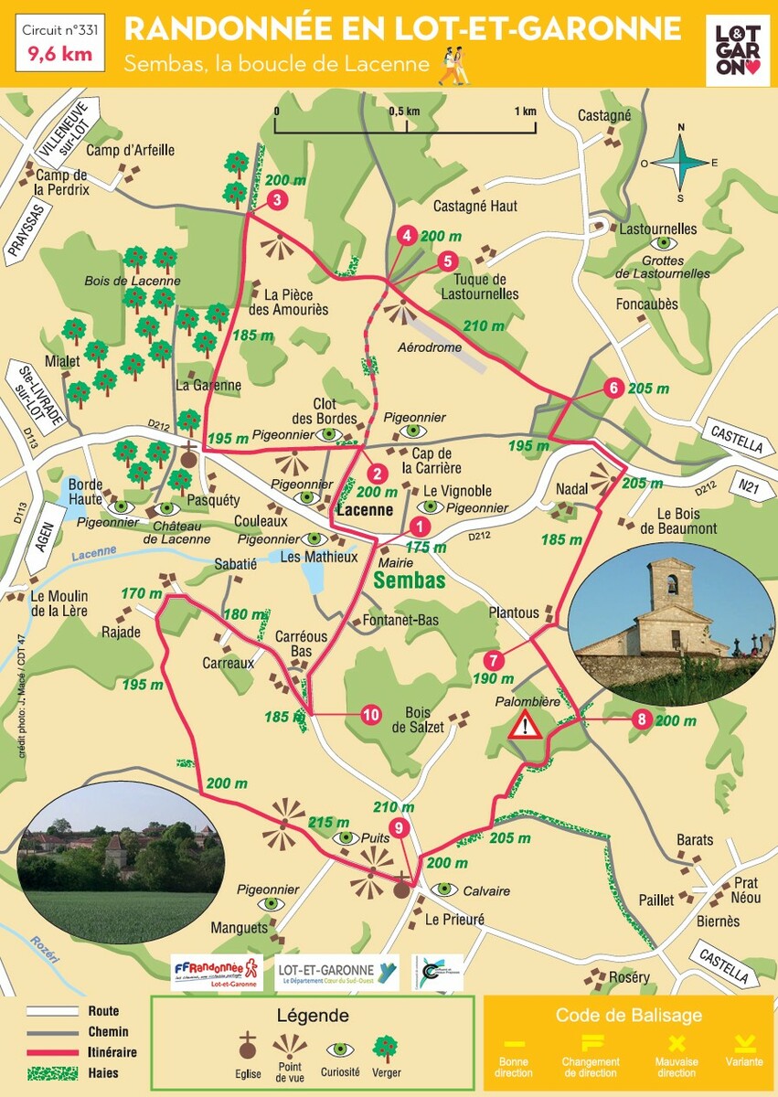 Matin : Dénivelée cumulée : 140 m. La commune de Sembas ne possède pas de bourg mais elle est constituée de nombreux hameaux. Ce circuit fait le lien entre la mairie, située près de Lacenne, son église éponyme et celle de Sembas au sud. AM : Dénivelée cumulée : 255 m. La première partie un peu escarpée et ombragée contraste avec le passage sur le plateau dégagé et sans obstacle pour la vue sur les communes de Castella, Sembas et Ste-Colombe-de-Villeneuve.