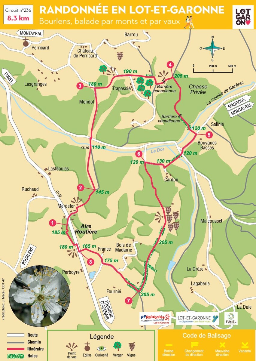 Dénivelée cumulée :400 m. De l’aire routière sur la D 102, entre Tournon-d’Agenais et Fumel, cette balade sans difficulté, si ce n’est le passage d’un gué, traverse la vallée boisée du Dor, le plateau de Perricard dans un verger de pruniers d’Ente et la Combe aride de Bazérac.