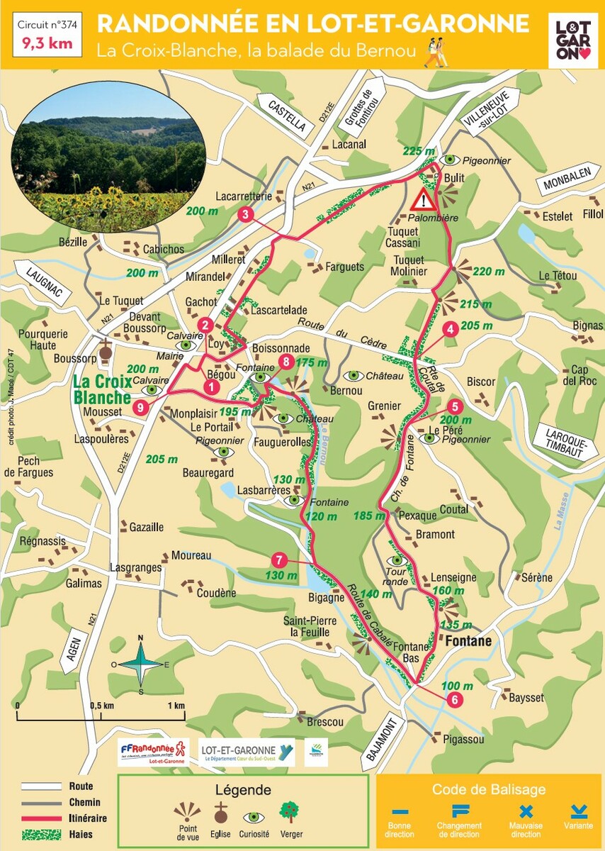 Dénivelée cumulée : 235 m. Ce circuit alterne des passages panoramiques au nord, des traversées de bois et de chemins ombragés avec des voies rurales ou communales à faible circulation dans la partie sud.
