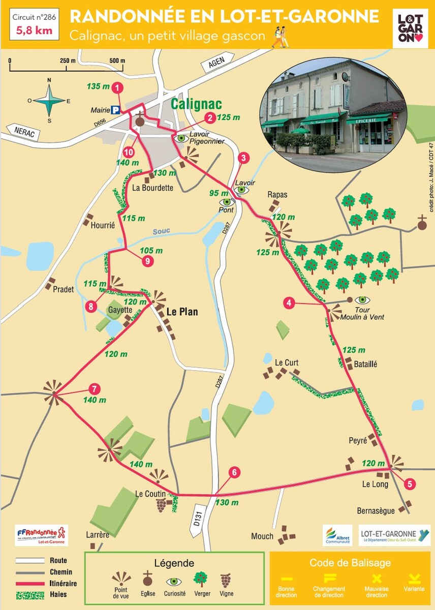 Dénivelée cumulée : 110 m. Il faut monter pour rejoindre Calignac. Site perché sur une butte au-dessus de la vallée de l’Auvignon, le village était autrefois fortifié et protégé par un château. Il reste quelques vestiges des remparts.